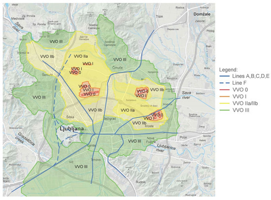 Protected groundwater areas in the Ljubljana Basin located relative to the potential underground routes of the railway and public transport are shown in Figure 4. The two Decrees [13,14] on the groundwater protection area for the Ljubljana Basin aquifers stipulate that underground structures may, exceptionally, be built in the narrower and the wider ground water protection area (GWPA–VVO in Slovenian) (areas VVO II and VVO III in the figure). However, such activities are not allowed around the narrowest protection (area VVO I) and within the direct water supply zones (VVO 0). In addition, as required by the Decree, the two conditions must be met for any underground construction works: (a) excavations in the narrowest and narrower water conservation areas are not permitted unless they are made more than two meters above the highest groundwater level, and (b) excavations in the wider water protection area are permitted above the mean surface water level, except in cases where the construction is exceptionally permitted under the condition that the aquifer’s transmissibility would not be reduced by more than 10%. Further on, the Decree stipulates that tunnels and subways may, exceptionally, be built in the narrower and wider water protection area (VVO II A, VVO II B and VVO III A) and the construction of these facilities is permitted without exception in the wider water protection area (VVO III B), in which a less severe protection regime applies.
