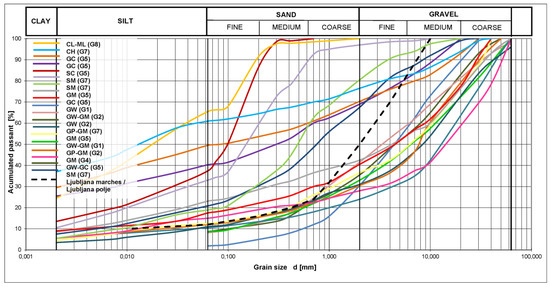 In addition to the geomechanical properties of the soil, the granularity of the soil is considered in particular detail as one of the key factors for the preliminary selection of the method of tunneling. The percentage of the individual fractions in particular has the critical impact on the Tunnel Boring Machine (TBM) performance for several reasons. The behavior of the material in the excavation chamber, the effectiveness of providing support for the excavation of the face, the removal of material, the use of additives, the possibility of further processing of the excavated material are all implicated by the granularity of excavated soil. The graph, presented in Figure 5, shows the representative grain curves for the soil layers, which were selected along the possible routes of the tunnels at depths of 16 m to 25 m in the Ljubljana Basin, both in the Ljubljana Marshes and in the Ljubljana Polje.