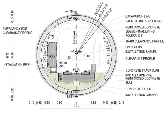 Characteristic TBM cross-section of one-track tunnel including the support system of reinforced segmental concrete lining.