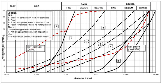 Thewes (2007) gives the recommendations for the efficient operation of TBM presented in the diagram shown in Figure 7. Three areas are allocated for slurry machines, annotated I, II and III respectively, under the following categorization: (a) I—the use of anti-fouling additives, the suspension is difficult to separate, (b) II—the optimal range of use, the separation is smooth, (c) III—the use of additives and fine particles for the effective support of the face. The four areas allocated for the EPB, annotated 1, 2, 3 and 4 respectively, are categorized as: (a) 1 use of water for consistency and foam to reduce adhesion, (b) 2 optimum operation of the device, use of foam to support the face, (c) 3 use of foam and polymer suspensions; water pressure < 2 bar, and (d) 4 use of foam, polymer suspensions and fine particles; water pressure = 0 bar. As indicated in Figure 7, based on the collected data for soils of the Ljubljana Basin, we can establish that the field of the EPB technology spreads also in the area of sand and gravel, mainly due to the introduction of additives in the form of foam and polymer suspensions. Again, it can be concluded that only slurry and EPB machines cover the needed range of properties for the soil layers of the Ljubljana Basin.