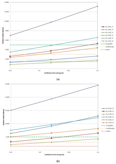 For a single two-track tunnel the acceptable values of maximum relative rotations are only to be achieved at the depth of 25 m and for VL of 0.5%. In the case of parallel one-track tunnels, the effects are considerably smaller and easily within the controllable range. The results are exceeding the conditionally limit value only at a depth of 16 m and for a VL of 1.5%. The results of the parametric study for different values VL and soil type coefficient k are presented separately for one two-track (single) tunnel and two one-track (double) tunnels in Figure 8, for 16 m and 25 m depth, respectively. It can be seen that the two one-track tunnels give much more environmentally sustainable subsidence impact than a single (large), two-track tunnel. The two one-track tunnels are also more appropriate for the safety and rescue conditions in the operational phase so, despite the obvious economic disadvantage, this is clearly the most appropriate solution for the possible underground transportation in the Ljubljana Basin.