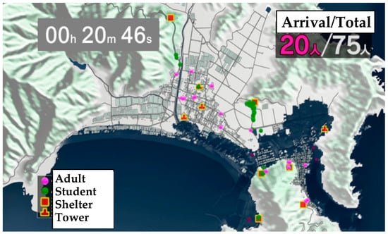 Then, following the accumulation of drill implementation data, the recordings were edited into a further multiscreen movie that we termed the “Version 2.0 movie” (Figure 3). The results of all evacuees’ GPS records were then overlaid on a GIS map on the movie. Similarly, the simulation results of an assumed Nankai Trough tsunami were also overlaid on the GIS map in order to check the rate of successful evacuations. In the Version 2.0 movie, each evacuee was represented by a small dot. A timer on the upper left-hand side of the movie represented the elapsed evacuation time. The upper right-hand side displayed a counter with two numbers separated by a slash. The number on the right represented the total number of drill participants. The number on the left counted how many evacuees successfully arrived at the evacuation facilities. In addition, the time taken by each evacuee to prepare for evacuation could be freely added on by experts, making it possible to calculate the maximum time needed by each person for a successful evacuation.