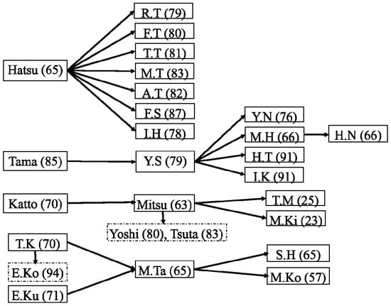 To attract older adults to do the single-person drill, we asked people who had conducted the drill to recommend at least one candidate. Through the method of recommendation, about 27 participants were involved in a snowball effect relationship (Figure 4). This indicated that nearly half (27 out of 55) of the adult participants were persuaded to do a single-person drill by previous evacuees. For example, 65-year-old Hatsu recommended at least seven residents to take part in the drill. Tama, 85 years old, recommended Y.S. (79), who further persuaded four people to perform the drill. Mitsu, who was 63 years old, rescued Yoshi (80) and Tsuta (83) in the drill performance. T.K. (70) rescued E. Ko (94) in the drill, and also recommended M. Ta (65).