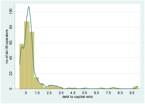 The empirical model can be estimated by ordinary least squares (OLS). However, OLS is extremely sensitive to influential observations and outliers because of the squaring of the residuals [63]. The estimation sample includes a large share of operators with a negative equity value, which leads to a debt-to-capital ratio of more than 100% (Figure 1). These extreme values can have a large impact on the estimates. One solution is to exclude these values, as conducted in the literature [54,64]. However, this leads to a sample selection bias. The other solution is to use robust regression methods that assign these observations less weight in the estimations [63]. Using balance sheet data drawn from the AMADEUS database, Farčnik et al. [65] apply the standard robust regression method developed by Huber [66]—referred to as the Huber robust regression model—to the determinants of the debt ratio of tourism firms in southern Europe. However, the Huber robust regression method cannot handle many influential observations, as is the case in this sample. It is suggested that the Huber estimator can only identify isolated outliers and is inappropriate when clusters of outliers exist [67]. Therefore, we use a variant of the MM-estimator developed by Yohai [68] and slightly modified by Verardia nd Croux [67]. This robust estimator can deal with a large share of influential observations and outliers (up to 50% of the sample, which is equal to a breakdown point of 0.50) and exhibit a higher statistical efficiency [67]. Ski resorts differ in their characteristics between eastern and western Austria, with ski areas in the East being located at lower altitudes, of smaller size, and less concentrated than in the West. Therefore, separate results are provided for eastern Austria (Carinthia, Styria, Lower Austrian, and Upper Austria) and for West Austria (Salzburg province, Tyrol, and Vorarlberg).