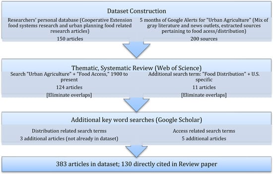 To identify the body of literature pertaining to the distribution of urban-produced foods, it was necessary to expand our search terms beyond “urban agriculture” and “food distribution”, and start with “food systems”, “distribution”, and “urban” as key search terms. We then filtered the results of this search to exclude articles pertaining solely to location of supermarkets in food deserts, a common area of research but not the focus of this study (we are particularly interested in the distribution of urban produced foods, rather than produce from most supermarkets). We also conducted searches for “urban foodshed” (a term introduced by permaculturist Arthur Getz in the 1990s; see [39,40]), “alternative food networks”, “informal food distribution” and “short food supply chains”, (a term more commonly used in Europe) in order to track down missing literature from our collection investigating the transfers of food produced in cities. This iterative search process on the distribution side reveals the difficulties in tracking informal food distribution networks, but also the importance of doing so to better understand the real impact of urban agriculture on food insecurity in cities.