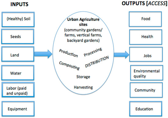 In asking the question “Can cities become self-reliant in food?” Grewal and Grewal [116] find that, in a best-case scenario, the City of Cleveland can achieve almost 100% self-reliance in fresh produce needs, poultry and eggs, and honey, but only with huge amounts of planning support (to devote necessary commercial rooftop space as well as vacant lots to food production). Blum-evitts puts forth a foodshed assessment tool to allow planners to assess local farm capacity in relation to local food needs [117]. Theoretical work such as this is important to advance ideas of what is possible and motivate efforts to make change, although it must constantly stay in dialogue with what is happening in practice and expand beyond a production-specific focus on local food systems. Urban farms are, after all, producing a lot more than food, and “increasing food production in cities does not guarantee that people experiencing food insecurity will access that food” [33]. As such, urban farms can be valued as a secondary food source for large populations, but primary forces for social integration, food-related education, and environmental justice [118]. UA is re-valued along a broader spectrum of “products” or outputs in Figure 3 below.