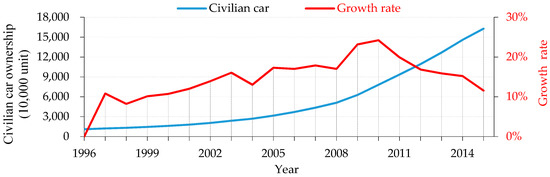 Growth of civil vehicles possession in China from 1996 to 2015.