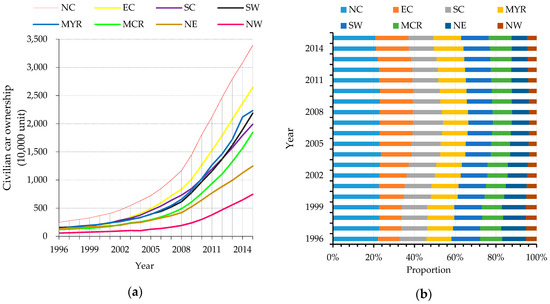 Development of civil vehicles in the eight economic zones: (a) Development curve of civilian vehicle possession in each region. (b) Change in civilian vehicle possession percentage of the total in each region from 1996 to 2015.