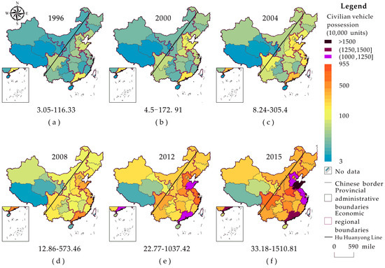 Temporal-Spatial distribution of civil vehicles’ possession in each province in some years: (a) 1996; (b) 2000; (c) 2004; (d) 2008; (e) 2012; (f) 2015.