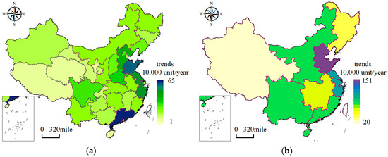 Spatial distribution of trends in the possession of civilian vehicles from 1996 to 2015: (a) Provincial scale. (b) Regional scale.