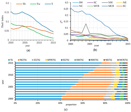 Disparities in the spatial distribution of civilian vehicles’ possession in china: (a) The changing in the T, Tb and Tw from 2000 to 2015; (b) The changing in the Tk from 2000 to 2015; (c) The changing in the contribution rates.