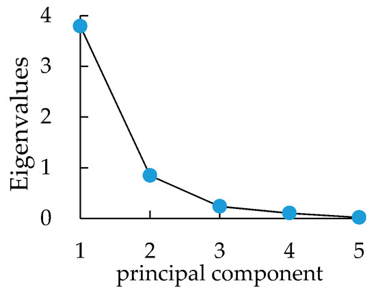 Scree plot of principal component analysis can be used to analyze the optimal number of extractions of the principal components [32]. The x-axis in the scree plot is the number of principal components and the y-axis is the eigenvalues. As shown in Figure 7, the first component has an eigenvalue of 3.79, which is greater than 1, starting from the second principal component, the curve decreases rapidly and the eigenvalues are all less than 1. It can be determined that it is more appropriate to extract the first component with most information being retained.