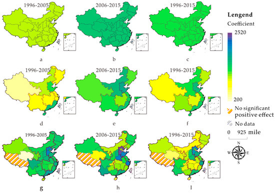 The spatial distribution of the coefficients of the panel data model established in three time: (a) The spatial distribution of panel data model coefficients in 1996–2005 at the national level; (b) The spatial distribution of panel data model coefficients in 2005–2015 at the national level; (c) The spatial distribution of panel data model coefficients in 1996–2015 at the national level; (d) The spatial distribution of panel data model coefficients in 1996–2005 of the eight economic regions; (e) The spatial distribution of panel data model coefficients in 2005–2015 of the eight economic regions; (f) The spatial distribution of panel data model coefficients in 1996–2015 of the eight economic regions; (g) The spatial distribution of panel data model coefficients in 1996–2005 at the provincial scale; (h) The spatial distribution of panel data model coefficients in 2005–2015 at the provincial scale; (i) The spatial distribution of panel data model coefficients in 1996–2015 at the provincial scale.