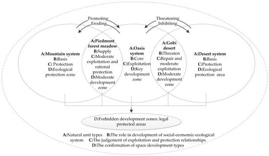 According to the concept of Major Function Oriented Zoning (MFOZ) to balance the spatial relationship between development and protection, territory spatial layout in MODS is divided into a key development zone, moderate development zone, ecological protection zone, and forbidden development zone [26]. As shown in Figure 1, according to the different roles of regional development (B) and government regulation of the legal reserve, the relationship between development and protection of the natural element (C) is clarified, and ultimately, the type of spatial development (D) is determined in the different natural units (A), forming a preliminary judgment on the natural conditions and development layout of the study area. Therefore, city management can quickly move towards coordinated regional development in which urban construction land meets the needs of urban development and food safety, and ecological land ensures a stable pattern of regional ecological security.