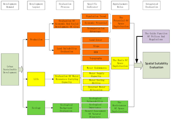 The main purpose of spatial suitability evaluation of an arid city is to provide a basis for the optimization of a spatial development pattern, i.e., to find out the promoting roles of population and economic factors to regional development (space development potential), the capacity of soil and water resources to regional development (space development foundation), and the constraint factors of the natural environment to regional development (space development constraint). According to the natural and social attributes of arid areas and their operability, spatial suitability evaluations should include evaluation of the ecological background, water resources carrying capacity, land construction suitability, and social and economic development ability, and they should also consider the influence of policies and regulations on the spatial layout. The evaluation process and specific indicators of spatial suitability are shown in Figure 2.