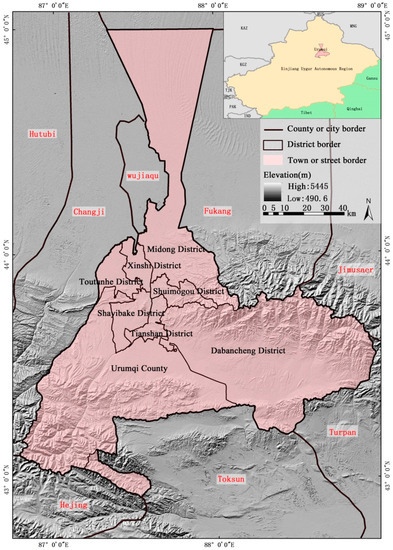 The study area (86°37′33″–88°58′24″ E, 42°45′32″–45°00′00″ N) was Urumqi city in the Xinjiang Uygur Autonomous Region (Figure 3), which is located in the hinterland of Eurasia, and lies at the Northern foot of Tianshan Mountain and the Southern edge of Junggar Basin. It covers an area of 13,753 km2, and the resident population is 2.22 million. The natural environment is a typical MODS which is composed of Southern mountains, a central oasis, and a Northern desert. It belongs to the central temperate continental arid climate, and has an annual average temperature of 6.9 °C and the average annual rainfall is 286 mm. The social environment is a multi-ethnic integration area, and the ecological environment is a high ecological pressure area. Its natural, economic, social, and cultural features are typical of Xinjiang, and the principle of index system is of great significance for the spatial suitability evaluation of Xinjiang.