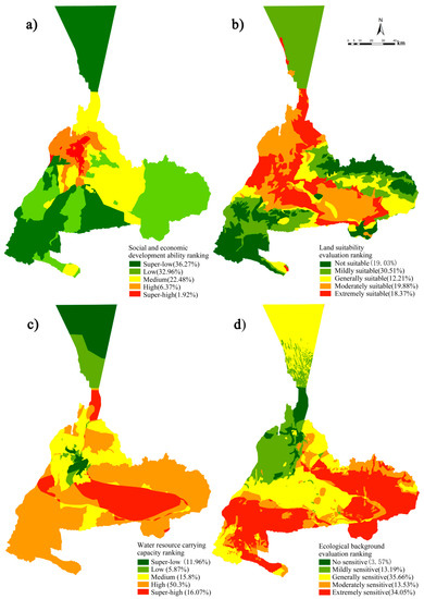 The sub-evaluations of spatial suitability in Urumqi: (a) evaluation of social and economic development ability; (b) land suitability evaluation; (c) evaluation of water resource carrying capacity; (d) ecological background evaluation.