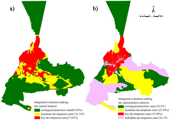 Integrated evaluations of spatial suitability in Urumqi: (a) integrated evaluation based on natural units; (b) integrated evaluation based on administrative units.