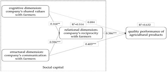 Improving the quality of agricultural products is the key factor in promoting agricultural development in the Belt and Road program. Although many studies have investigated the relationship between social capital and performance, the findings are inconsistent. Moreover, the mechanism of how social capital affects the quality performance of agricultural products remains unclear. Accordingly, this study developed a theoretical model with propositions from a social capital-quality performance of agricultural products paradigm for examining and comparing the three dimensions of social capital: The relationships among cognitive (measured by shared values), relational (measured by reciprocity) and structural (measured by communication), and their role in ensuring quality performance of agricultural products from the company and farmer perspectives. This study selected the companies and farmers in “A company + farmers” model. The data analysis is based on a sample of 184 companies and 414 farmers. The results show that shared values and communication have a significant positive effect on reciprocity. In terms of the influence on reciprocity, communication is higher than shared values from both the corporate and farmer perspectives. The three dimensions of social capital have different effects on quality performance of agricultural products. On the company side, communication and reciprocity in social capital have a significant positive effect on the quality performance of agricultural products, with the order of effect being communication first followed by reciprocity. On the farmer side, reciprocity and shared values have a significant positive effect on the quality performance of agricultural products, with the order of effect being reciprocity first followed by shared values. These findings have positive theoretical and practical significance for companies and farmers aiming to improve the quality of agricultural products.