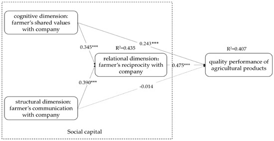 The empirical results show that the three dimensions of social capital (shared values, reciprocity, communication) have different effects on quality performance of agricultural products. From the companies’ perspective, reciprocity (β = 0.386, p < 0.001) and communication (β = 0.403, p < 0.001) have a significant positive effect on the quality performance of agricultural products. Thus, while H2b and H2c are supported, H2a is not supported. From the farmers’ perspective, the shared values (β = 0.243, p < 0.001) and reciprocity (β = 0.475, p < 0.001) have a significant positive effect on the quality performance of agricultural products; thus, H2a and H2b are supported, while H2c is not supported. This result is different from the result of Yim and Leem [18] who reported that the three dimensions of social capital positively affect performance. However, that study only empirically explored the company’s economic performance and used just one item to measure quality performance.