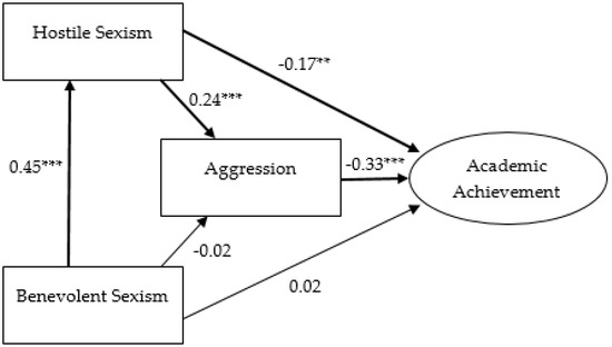 In summary, hostile and benevolent sexist attitudes hinder the academic achievement of adolescent girls and boys [21,23]. Moreover, hostile sexism can become a risk factor for aggressive behaviour [11,12,47,50], which may also affect academic achievement [13,14,15], and benevolent sexism can become a risk factor for hostile sexism. In adolescent girls and boys, this relationship may be mediated by physical and verbal aggression. Therefore, benevolent sexism has a clear role in academic performance through hostile sexism and aggression.