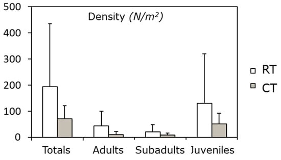 Earthworm density (i.e., individual numbers m−2) in conventionally tilled fields (CT) and fields under reduced tillage (RT), averaged over a 3-year period (2009–2011).