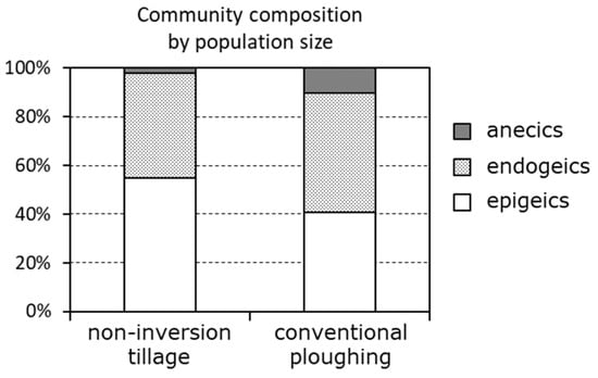 Earthworm community composition in ecological groups (anecic deep dwelling species, endogeic soil dwelling species, epigeic top soil, and litter dwelling species) under reduced tillage (various methods of non-inversion tillage were used) and conventional tillage (mouldboard ploughing).
