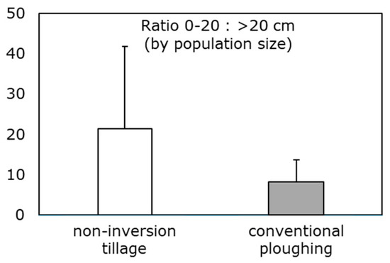 Depth distribution ratio of earthworms under reduced tillage (various methods of non-inversion tillage were used) and conventional tillage (mouldboard ploughing), expressed as the ratio of the numbers of individuals found in the 0–20 cm topsoil over the number of individuals extracted by mustard oil (AITC) extraction from the pit after removal of a 30 × 30 × 20 cm soil block (i.e., topsoil, for hand sorting).