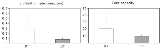 Water infiltration rate (mm/minute) under reduced tillage (RT) and conventional mouldboard ploughing (CT) (data for 2011 only), and an estimate for pore volume capacity (imensionless), calculated as the difference between initial infiltration rate and the rate at constant infiltration in a double ring infiltrometer).