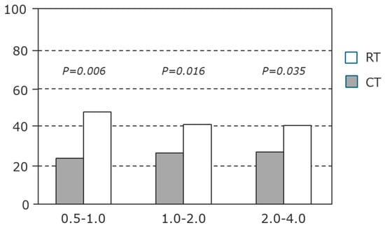 Soil aggregate stability (% stable aggregates by weight) in different size classes under reduced tillage (RT) and conventional mouldboard ploughing (CT).