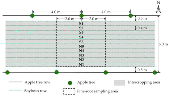 The experimental design included three replications per treatment. The apple–soybean intercropping treatments included a 12.0 × 15.0 m plot that consisted of fourteen apple trees intercropped with soybean plants. The monocropped apple tree treatments were the same size (12.0 × 15.0 m) but consisted of only fourteen apple trees; the monocrop soybean treatment was also the same size (12.0 × 15.0 m). The area within 0.5 m of the apple tree row was used for fine-root sampling (4.0 × 4.0 m) in both the apple–soybean intercropping system and the apple tree monocropping system treatments (see Figure 1). The fine-root sampling area was divided into ten equally sized sections denoted as S1, S2, S3, S4, S5, N5, N4, N3, N2, and N1. Among them, S1, S2, S3, S4, and S5 were south of the apple tree row at a distance of 0.5–0.9, 0.9–1.3, 1.3–1.7, 1.7–2.1, and 2.1–2.5 m, respectively, and N1, N2, N3, N4, and N5 were north of the apple tree row at a distance of 0.5–0.9, 0.9–1.3, 1.3–1.7, 1.7–2.1, and 2.1–2.5 m, respectively. Three sections (4.0 × 0.4 m) were randomly selected in the soybean monocropping treatment. The vertical soil profile in each section was divided into five soil layers (0–20, 20–40, 40–60, 60–80, and 80–100 cm) to excavate and collect the apple roots and soybean roots.