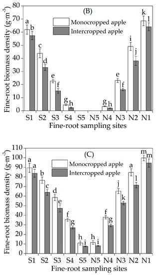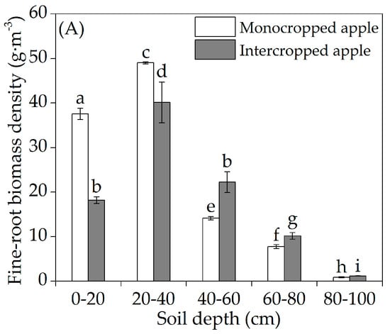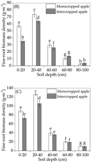 Vertical distributions of fine-root biomass density in (A) apple trees monocropped for 3 years and 3-year-old apple trees intercropped with soybean plants; (B) apple trees monocropped for 5 years and 5-year-old apple trees intercropped with soybean plants; and (C) apple trees monocropped for 7 years and 7-year-old apple trees intercropped with soybean plants. The error bars indicate the standard deviations. The means with different letters within a row and column are statistically significant (p < 0.05).