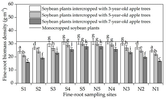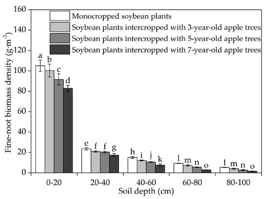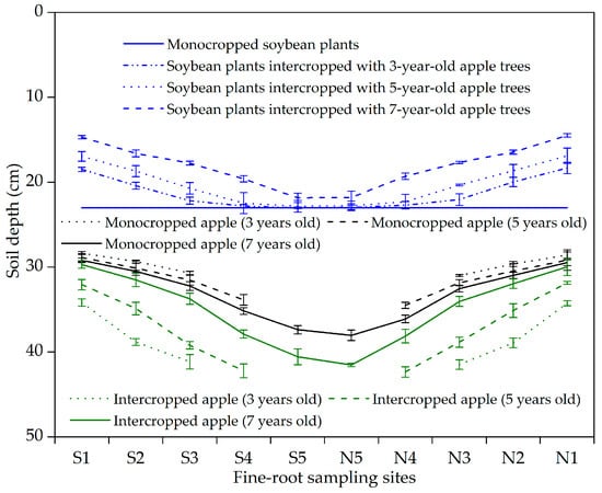Vertical distributions of fine-root biomass density in monocropped soybean plants and soybean plants intercropped with 3-, 5-, and 7-year-old apple trees. The error bars indicate the standard deviations. The means with different letters within a row and column are statistically significant (p < 0.05).