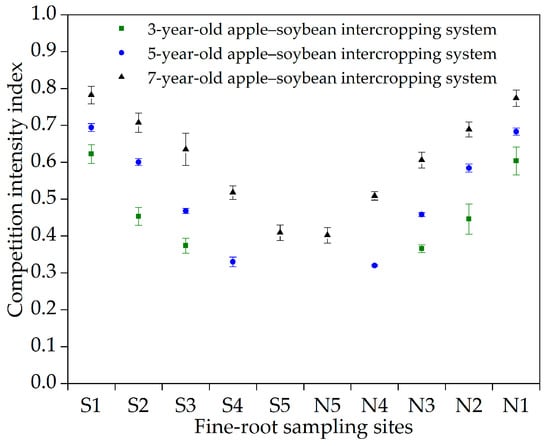 Below-ground interspecific competition intensity index of 3-, 5-, and 7-year-old apple–soybean intercropping systems. The error bars indicate the standard deviations.