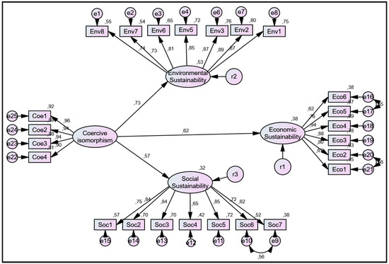 Whilst the measurement model pertains to the relationships between latent variables and their respective observed variables, the structural model is concerned with the relationships between the latent variables [56]. Following the validation and attainment of satisfactory fitness on all the constructs in the measurement model, the structural model can be assessed as the second and last stage of SEM. Thus, in this case, the causal relationships between coercive isomorphism and sustainable development (economic, environmental and social) are assessed. Alternatively, the causal relationships that were stipulated in the hypotheses are evaluated in the structural model.