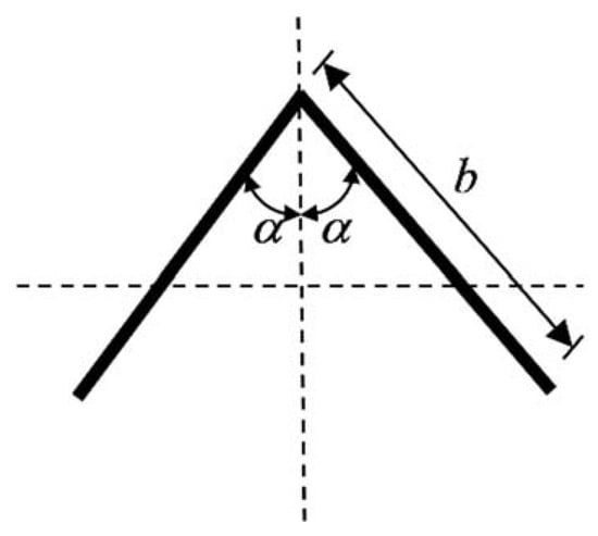 Angle beam section is illustrated in Figure 2. The variational method can be applied to examine the equilibrium of the flange when the angle beam is bent by pure bending moment. Referring to Figure 3, a system of coordinates x, y, z, and of displacements u, v, w, is described. The axis of x is parallel to the beam axis and the axis of z is normal to the flange. The thickness of the flange is defined as t, the length of side as b, and the angle between flange and the symmetry axis of the section as α.