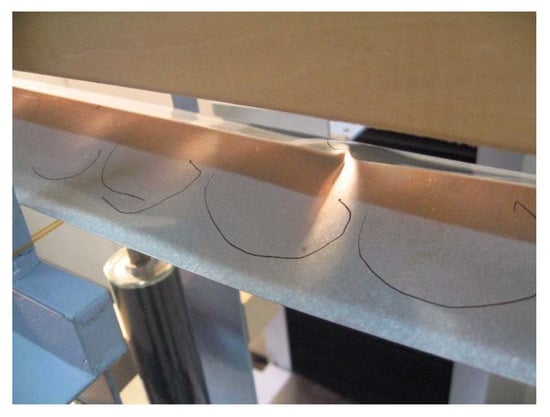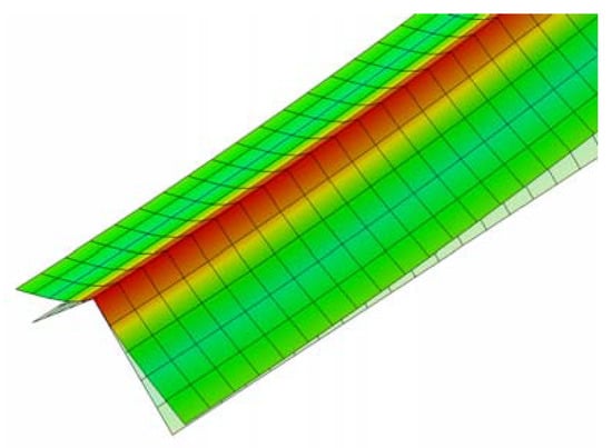 Two specimen types—i.e., specimen type A and B with individual kind of section sizes—were tested. The numerical, theoretical, and experimental results are shown in Table 4. As for the FEM analyses, both elastic and elasto-plastic material are considered. During the experiment, it was demonstrated that the wave of plate buckling was generated and developed, which obviously decreased the bending stiffness of the beam. Nevertheless, the collapse is not controlled by the plate buckling, but by Brazier flattening, load-point crippling, or ridge-line buckling. The collapse mode of specimen type A is Brazier flattening. When the collapse was governed by flattening, the moment–curvature curve is different from the linear beam theory, but well coincides with the flattening theory in consideration of the end effect. For specimen type A which shows Brazier flattening collapse, the theoretical maximum moment is 17.97% smaller than the experimental maximum moment and close to the numerical values. Substituting α = 60° and the parameter in Table 3 to Equation (20), the threshold ratio of width to thickness gets the value of 117, which is bigger than the ratio of width to thickness of specimen type A. This means that yielding happened in the specimen before Brazier flattening. The picture of Brazier flattening of specimen A3 is shown in Figure 10. However, for specimen type B, load-point crippling or ridge-line buckling occurred before Brazier flattening happens. Thus, the experimental max moments are far below theoretical value, Brazier flattening is unlikely to happen in specimen type B.