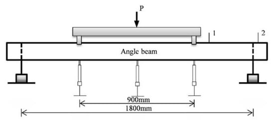 The result of a symmetrical four-point bending test was used to compare with theoretical results. The illustration of the experiment setup is shown in Figure 9. The total length of the thin-walled angle beam is 1800 mm. Three displacement meters were set to measure the vertical displacement at the load points and the center point. The material properties of the specimen are shown in Table 3.