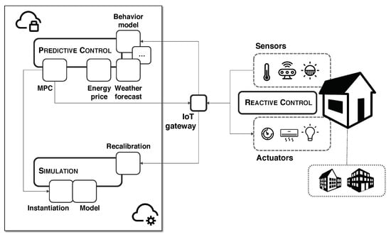 The enabling technologies can interoperate in different ways to materialize the CaaS vision. In Figure 1, we propose a prospective architecture of a CaaS system serving a set of domestic buildings. Our proposal is based on the combination of two components: a predictive control module, which uses MPC for long-term energy optimization, and a reactive control module, which uses local controllers for short-term adjustment of the operation.