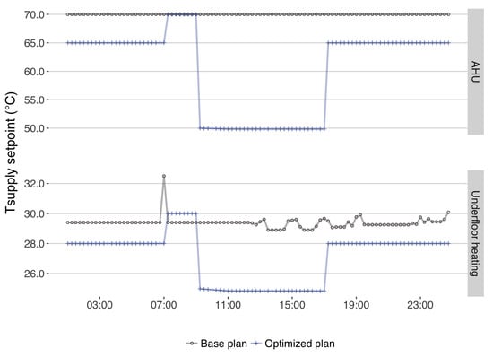 Temperature supply setpoint values of the base and the optimized operational plans simulated in the intermediate day (6 February 2017).