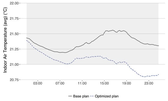 Figure 2 shows a comparison of the normal operation versus a simplistic, but optimized plan for the intermediate winter day (6 February 2017). We can see that the base plan setpoint values are almost constant and high, whereas the optimized plan reduces the setpoint values in the middle of the day when the occupancy of the hotel is lower. The average indoor air temperature for each plan is shown in Figure 3, in which we can see that the optimized plan yields values around 21 C, slightly slower than the base plan, but mostly within the comfort interval C. Note that the average outdoors air temperature this day was around −12 C.