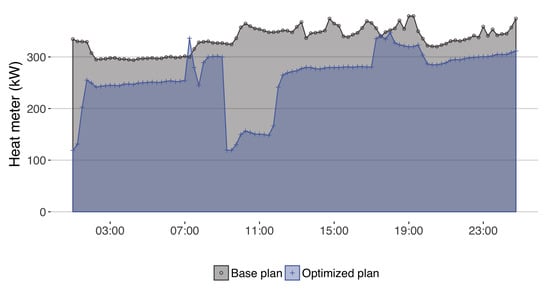 Power consumption of the base and the optimized operational plans obtained after simulation in the intermediate day (6 February 2017).