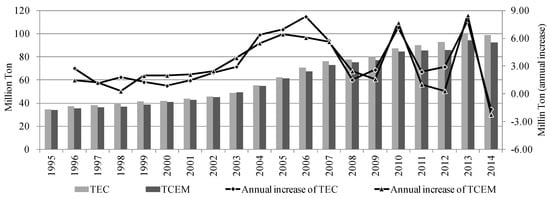 From the perspective of total energy and carbon emissions, both TEC and TCEM showed gradual upward trends from 1995 to 2014 with an average annual increase of 3.40 million tonnes of coal equivalents and 3.07 million tonnes of carbon, respectively (Figure 1). Their annual increases were initially rather significant, especially in the years 2005, 2006, and 2007. After 2007, the annual increase fluctuated at a similar scale between TEC and TCEM. The first negative growth in either occurred in 2014.