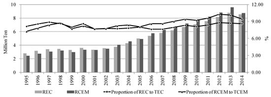 Residential energy consumption (REC) and residential carbon emissions (RCEM), Shanghai 1995–2014.