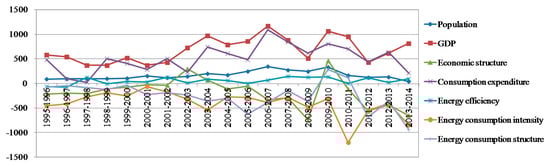 The LMDI analysis indicated that total economic output, resident consumption level, and population size exerted positive impacts on TCEM, suggesting that economic development, population concentration, and enhancement of living standards were the main contributors to TCEM. Economic output and residents’ consumption level were of the greatest significance in this regard (Figure 4). Energy consumption intensity, energy consumption structure, and economic structure appeared to exert negative impacts on carbon emissions; energy consumption intensity was most significant among them. Energy structure was expressed by the proportion of coal to TEC, so it was suggested that it would be beneficial to reduce TCEM by using less coal (which had significantly higher carbon emissions intensity than other energies).