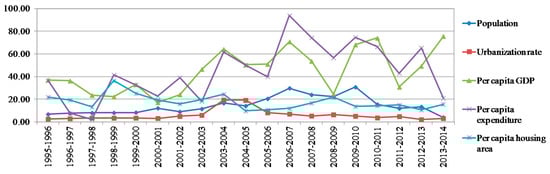 All the chosen factors indeed played roles in RCEM but showed varying levels of significance. Among them, per capita GDP and per capita expenditure were the most significant driving factors and their significance tended to increase over the study period; this indicated that economic development and enhancement of living standards had led to an increase in REC and a substantial increase in RCEM in Shanghai (Figure 5). Per capita housing area and population size also played significant roles, but the impact of urbanization was relatively small.