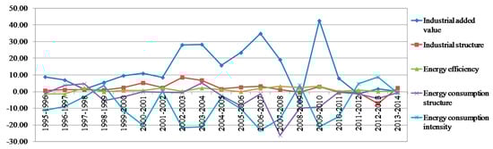 Under the World Bank’s standard, Shanghai has developed from a lower middle-income to a high-income city since 1995. The amount and structure of energy consumption changed significantly throughout this transition. TEC has trended upward and become stable, while TCEM continually increased from 1995 to 2014. The results from 1995 to 2000 were in accordance with a previous report by Qian and Yu [45], who analyzed carbon emissions in Shanghai, but the results based on actual data after 2000 exceeded their predictions suggesting that projections of energy consumption and carbon emissions are tenuous and require careful consideration.