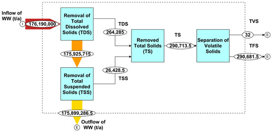 By performing a mass flow analysis of different types of solids found in the wastewater in Qatar, as per the characterization of Doha’s wastewater shown in Table 4 (TSS: 150 mg/L = 1.5 × 10−4 t/m3; TDS: 1500 mg/L = 1.5 × 10−3 t/m3; TVS: 110 mg/L = 1.1 × 10−4 t/m3), in combination with the total amount of 176,190,000 t/a wastewater, we get the estimate amounts of total solids (TS) and its fractions into the total suspended solids (TSS), total dissolved solids (TDS), total volatile solids (TVS), and total fixed solids (TFS) (Figure 1). While the amounts of TSS and TDS can be directly calculated from their concentrations in wastewater, TS is obtained as their sum (TS = TSS + TDS). The concentration of TFS is not known; however, the concentration of TVS is known and the amount of TVS can, therefore, be directly calculated, and the amount of TFS is obtained through the closure of the mass balance (TFS = TS − TVS).