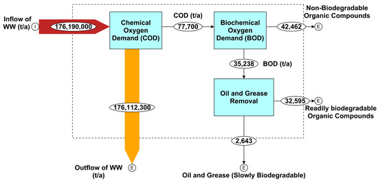 Performing the mass flow analysis of COD and BOD based on the characterization of wastewater in Qatar (Table 4: COD: 441 mg/L = 4.41 × 10−4 t/m3; BOD: 200 mg/L = 2 × 10−4 t/m³) reveals that the total amount of organic compounds generated in Qatar per year is about 77,700 metric tons (Figure 2), of which around 45% are biodegradable (ca. 35,250 t/a BOD) and around 55% are non-biodegradable (ca. 42,500 t/a). Out of the biodegradable amount, around 92.5% (ca. 32,600 t/a) are readily and rapidly biodegradable compounds. The mass flow analysis further shows that the estimated amount of oil and grease is more than 2600 t/a, representing around 7.5% of the biodegradable organic compounds.