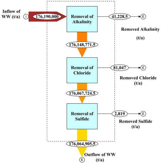 The mass flow analysis of alkalinity, chloride, and sulfide of Qatar’s wastewater (elaborated with STAN software); all flows are in metric tons per year.